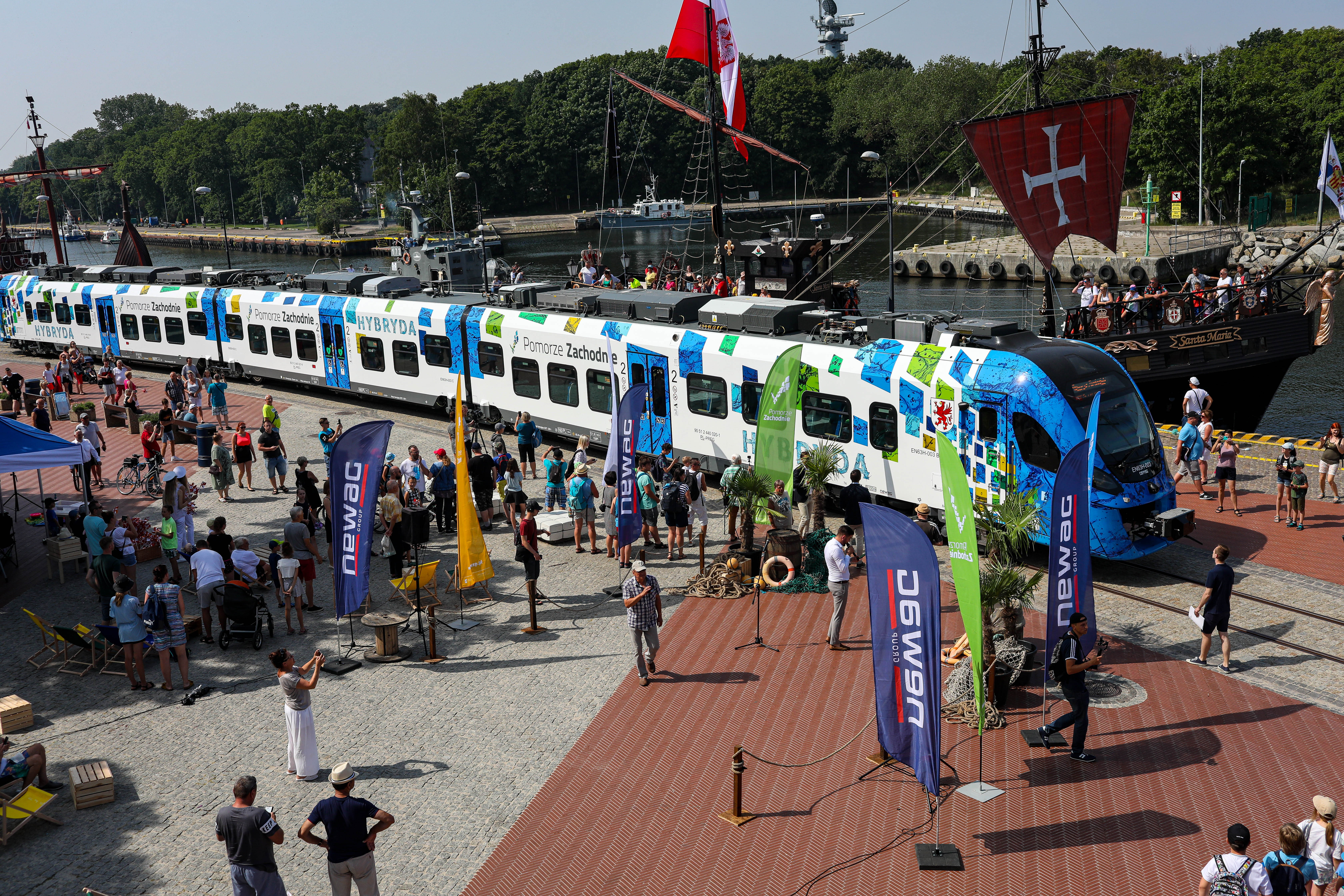Mieszkańcy i turyści na powitanie robili zdjęcia, a później bardzo licznie i z bardzo bliska oglądali hybrydowy pociąg. Była okazja sprawdzić, jak przestronne jest wnętrze, jak wygodne fotele, jakie wyposażenie znajduje się na pokładzie. Plenerowe wydarzenie w kolejowo-marynistycznym klimacie trwało do godziny 14. Na uczestników czekało wiele atrakcji. Nawet spotkanie z piratem. Była też fotobudka, dla najmłodszych - zajęcia z animatorami, konkursy i zabawa przy muzyce. Przygotowano również upominki i dużą porcję wiedzy (materiały edukacyjne) na temat ekologicznego transportu i walorów Pomorza Zachodniego.