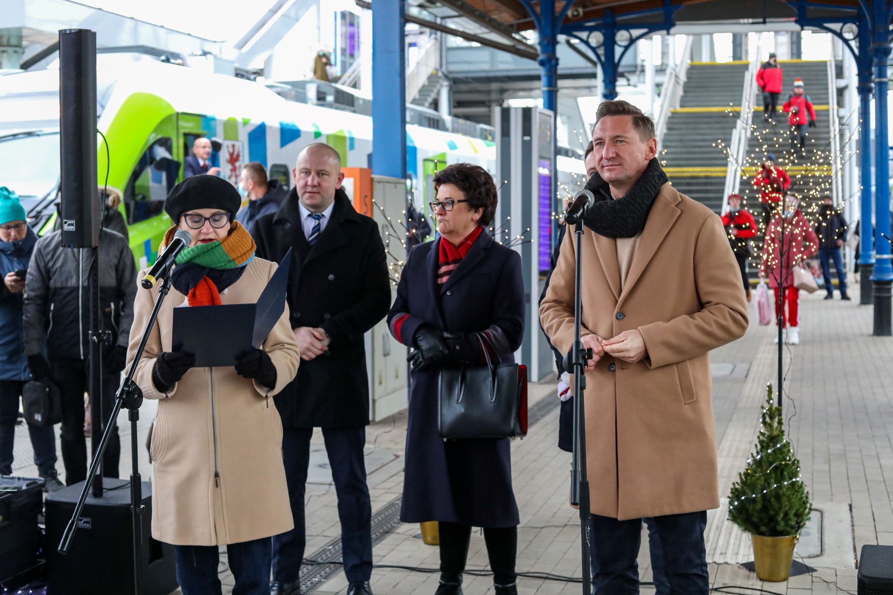 W powitaniu hybryd uczestniczyli również wicemarszałek Tomasz Sobieraj, przedstawiciele firmy NEWAG - Sławomir Walaszek, kierownik Działu Zarządzania Projektami, odpowiedzialny za realizację kontraktu, oraz Tomasz Pancerz, kierownik projektu. Pojazdy „wprowadził” na miejsce uroczystości Andrzej Chańko, dyrektor Zachodniopomorskiego Zakładu POLREGIO. Najnowszy tabor do obsługi regionalnych połączeń kolejowych obserwowała również Jadwiga Rajkiewicz, dyrektor Wydziały Infrastruktury i Transportu UMWZ. A także kilkudziesięciu pasażerów, którzy wchodząc do pachnących nowością pociągów raczyli się również pachnącymi piernikami i gorącą czekoladą. I nie był to koniec przedświątecznych niespodzianek. Marszałek Olgierd Geblewicz rozdawał wszystkim podróżnym maskotki i składał życzenia.