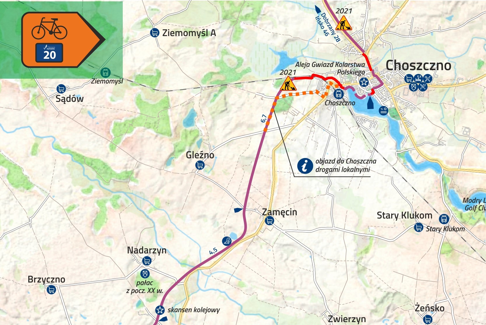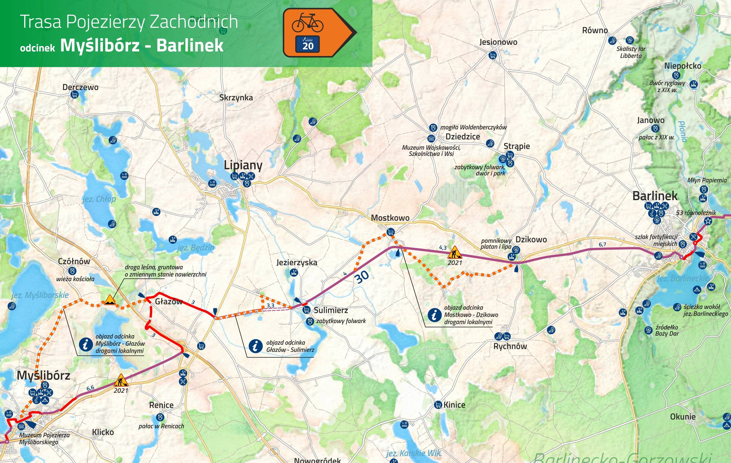 Malownicza Trasa Pojezierzy Zachodnich (oznaczona jako nr 20) w tym roku zyska kilka kolejnych „łączników”, dzięki którym będzie można wygodnie i bezpiecznie przejechać od polsko-niemieckiej granicy w głąb województwa. Trwa budowa m.in. brakujących odcinków w rejonie Trzcińska-Zdroju i Myśliborza oraz Wapnicy w powiecie stargardzkim i Drawska Pomorskiego, a w ubiegłym tygodniu podpisano umowę z wykonawcą trzech kolejnych fragmentów TPZ. Do 15. października br. ma powstać ponad 6 kilometrów ścieżki z Mostkowa do Dzikowa oraz dwa około dwukilometrowe ścieżki blisko Choszczna. Na południe od miasta – z okolic dworca kolejowego w stronę wsi Koplin. Na północ – do miejscowości Pakość.